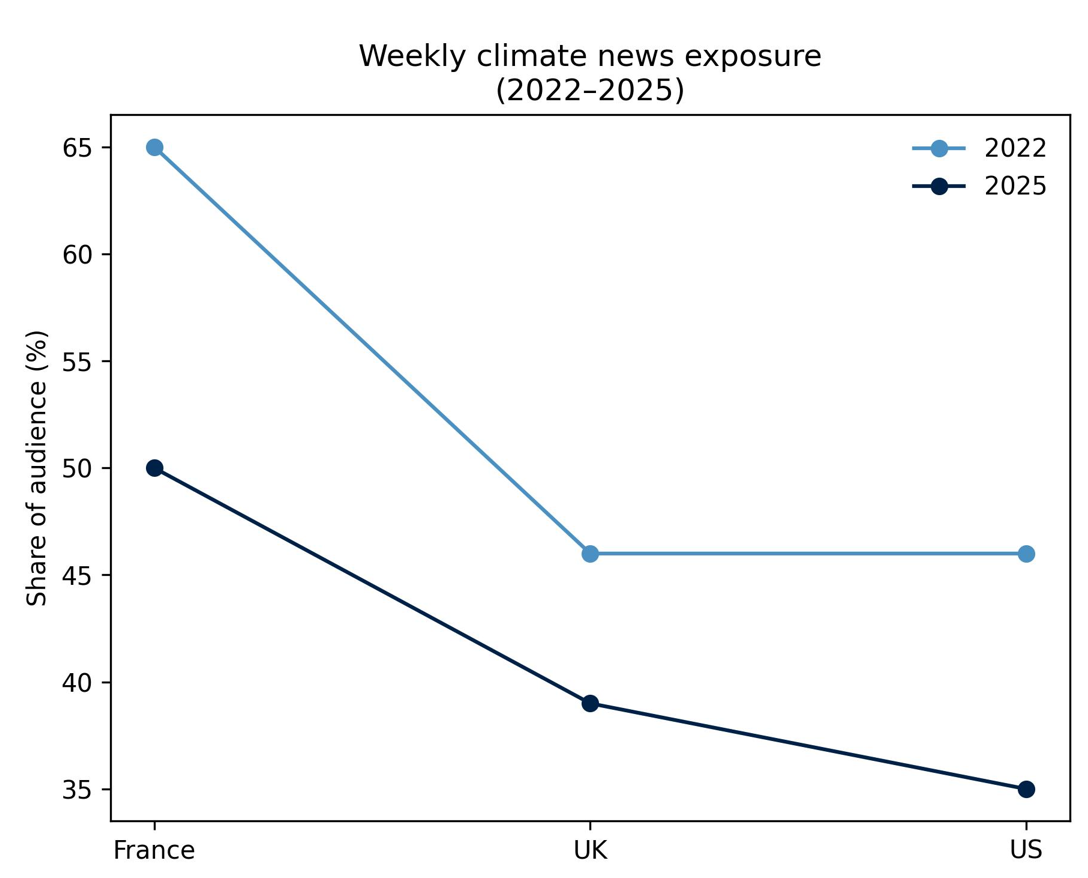 Second, the decline is concentrated among older audiences. Across the eight surveyed countries, weekly exposure to climate news among people aged 55 and over has fallen by around 10 percentage points since 2022, from 72% to 62%.This group has traditionally relied more heavily on television news, making it particularly affected by reduced TV use for climate coverage.