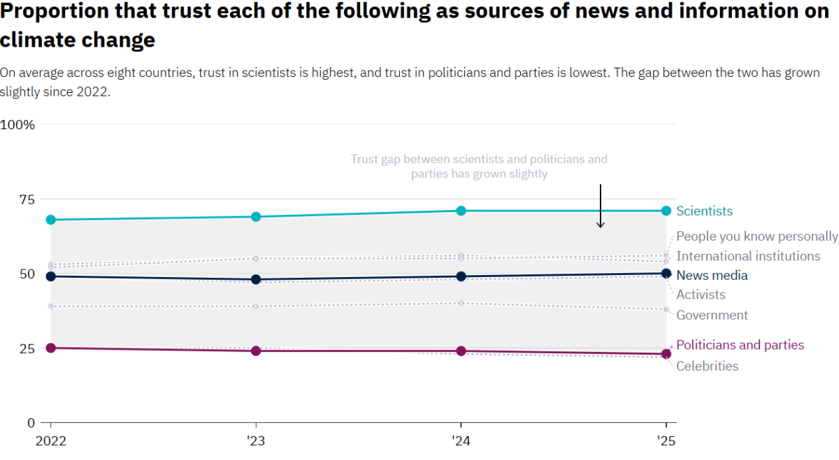 The findings also reveal a pronounced credibility gap. Trust in scientists as a source of climate information remains high across the surveyed countries and has even increased slightly since 2022, reaching an average of 71%. By contrast, confidence in political leaders on climate change is markedly lower: only around one in three respondents on average say they are confident that political leaders have the right priorities and are making the right decisions on climate policy. The report highlights substantial variation between countries, but the overall pattern is consistent.
