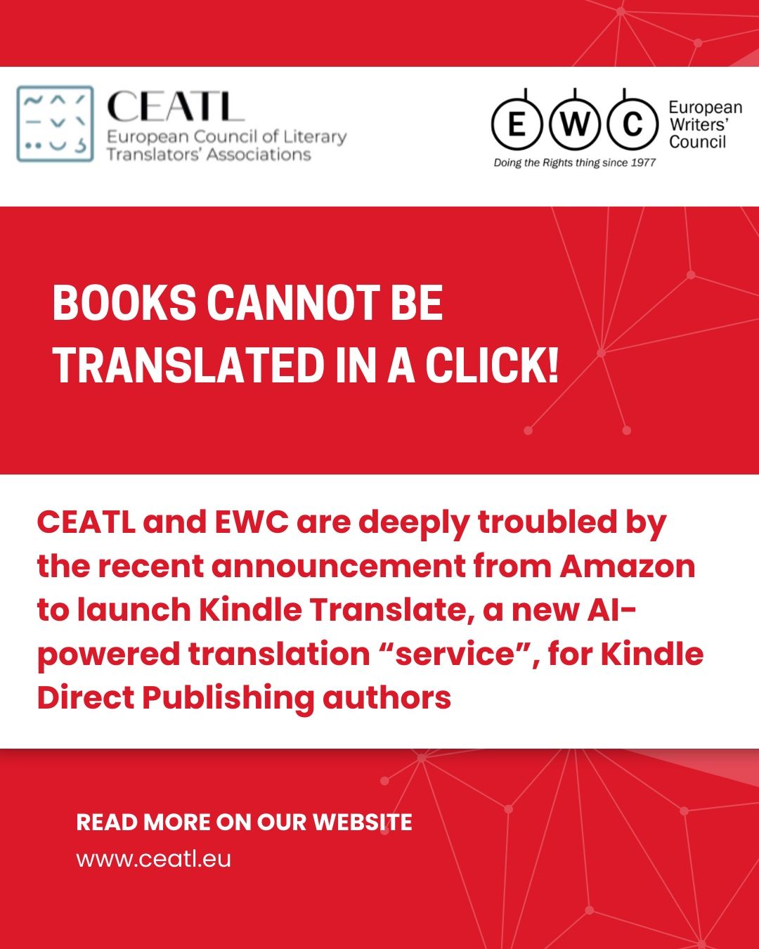 Following Amazon’s announcement on AI-powered tool Kindle Translate, the European Council of Literary Translators’ Associations (CEATL) and the European Writers’ Council (EWC) call on the global book sector to protect culture and human creativity, against the logics of mere profit.