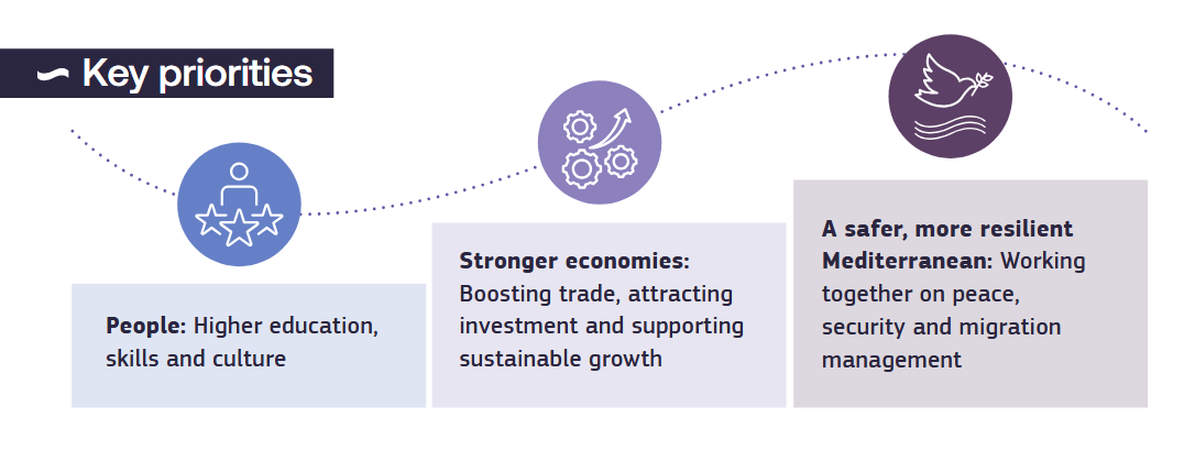 Education cooperation includes the creation of a Mediterranean University, connecting students across the Euro-Mediterranean region and offering joint programmes, degrees and other educational activities, such as shared courses and summer schools.