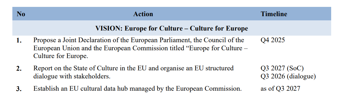 She announced a Joint Declaration on 'Europe for Culture - Culture for Europe' as high-level political commitment of the European Parliament, Council and the Commission “in building a future where Europe stands for culture, and culture stands for Europe”. The declaration may be expected before the end of 2025.