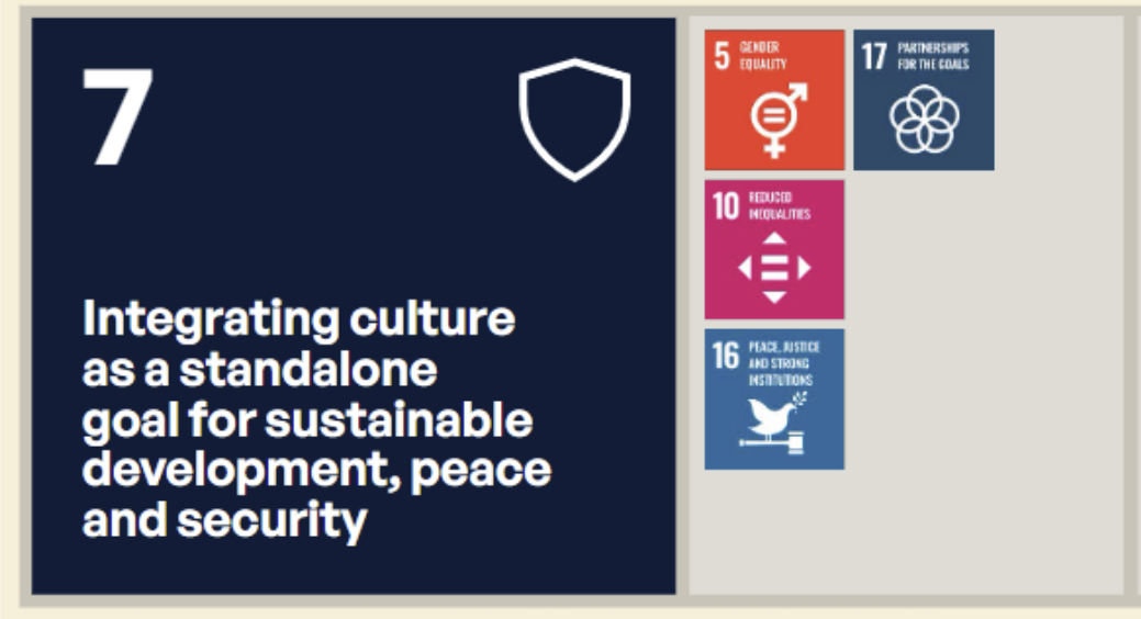 Signaling a critical juncture among “political will, community leadership and data-driven insight” the Report argues that “Only a stand-alone goal can provide the visibility, coherence and ambition that the cultural field urgently requires”.