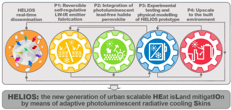 HELIOS, led by Anna Laura Pisello, aims to cool cities through radiative materials that reflect sunlight and heat. The HELIOS project is developing various temperature-responsive building materials aimed at mitigating the Urban Heat Island (UHI) effect and improving energy efficiency. These include carriers using lead-free halide perovskites, albedo adaptive photoluminescent finishes, and bio-inspired radiative skins designed to adapt to environmental conditions.