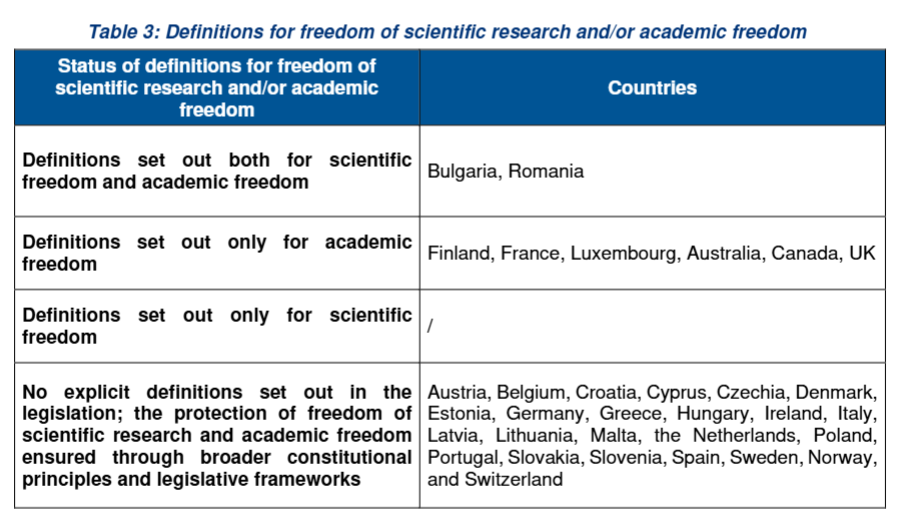 For example, 24 countries under study have no explicit definitions in their legislation, Bulgaria and Romania have set definitions for both scientific and academic freedom, while only academic freedom is defined in Finland, France, Luxembourg, Australia, Canada and the UK.