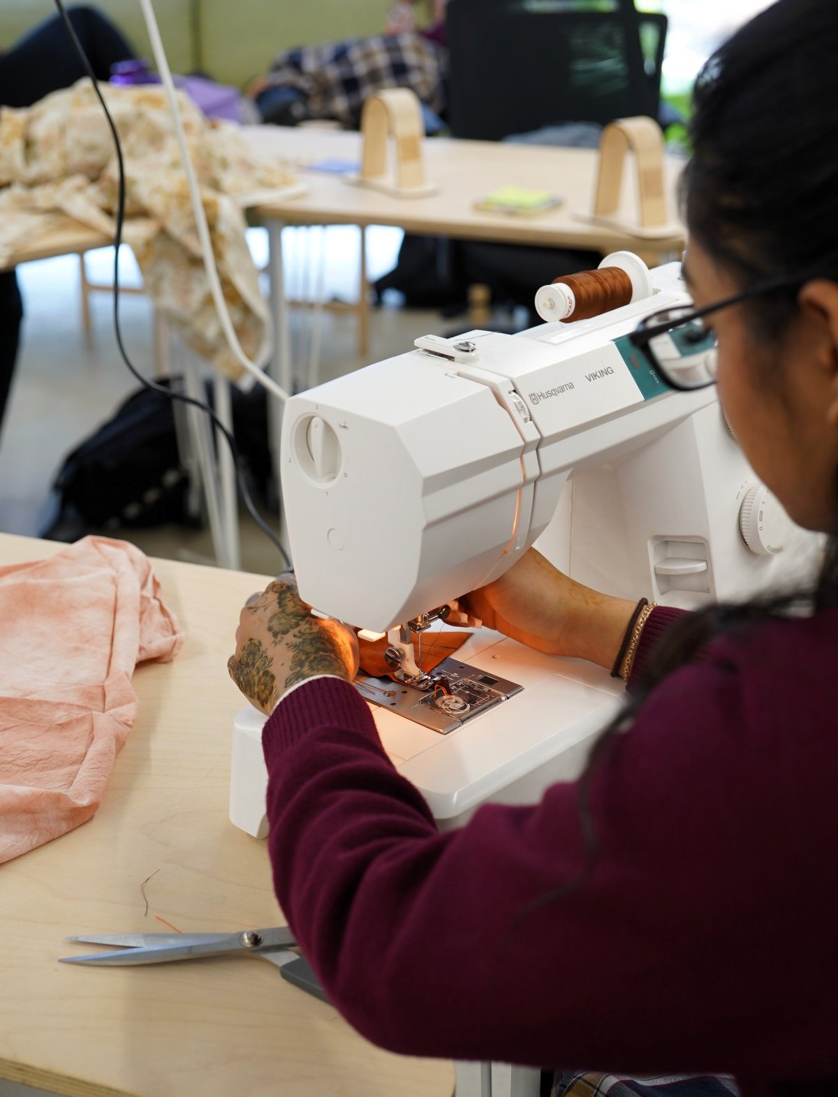 At the beginning of their learning experience, the participating students visited a local charity shop, where, under the guidance of independent designer Megan McGuigan of the fashion brand Seeking Judy, they obtained second-hand clothing suitable for upcycling that would form the basis of their collection. The students also became familiar with processes such as screen printing and laser cutting, learning how to create unique visuals and designs on their garments and elevating them. Furthermore, the Learning Lab introduced the students to natural dyeing, custom embroidery using digital machines, and basic sewing and tailoring skills, which would enable them to alter and reshape garments.