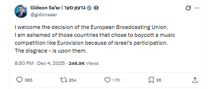 The president of Spain's RTVE, criticised the decision as evidence that “Eurovision is not a song contest, but a festival dominated by geopolitical interests.” Slovenia's Radiotelevizija Slovenija questioned the legitimacy of the Israel-Hamas ceasefire agreement, citing ongoing casualties.