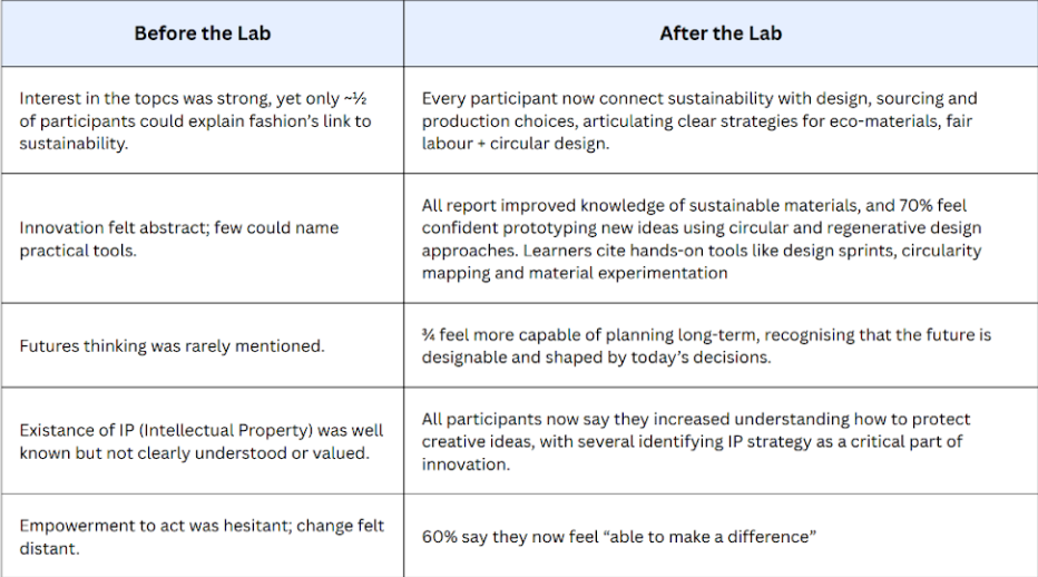 The Learning Lab transformed students from passive learners into active, future-shaping change-makers. Through hands-on experimentation with biomaterials, design thinking, and real-world challenges, participants gained not only technical skills but also a more in-depth understanding of sustainability, intellectual property, and creative agency.