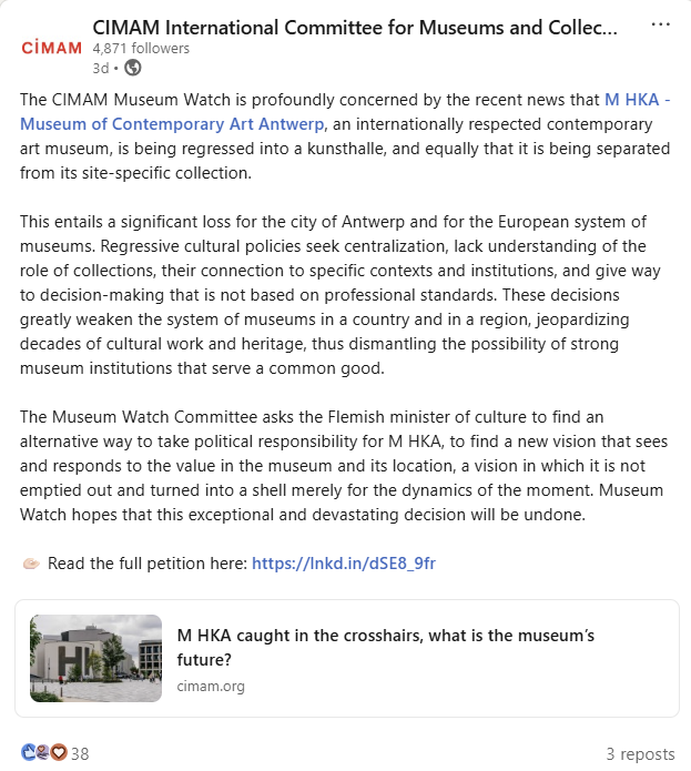This is an “unexpected” and “regressive” decision, signaling “a significant loss for the city of Antwerp and for the European system of museums,” said the Museum Watch Committee of the International Committee for Museums and Collections of Modern Art (CIMAM), an affiliated organisation of ICOM.