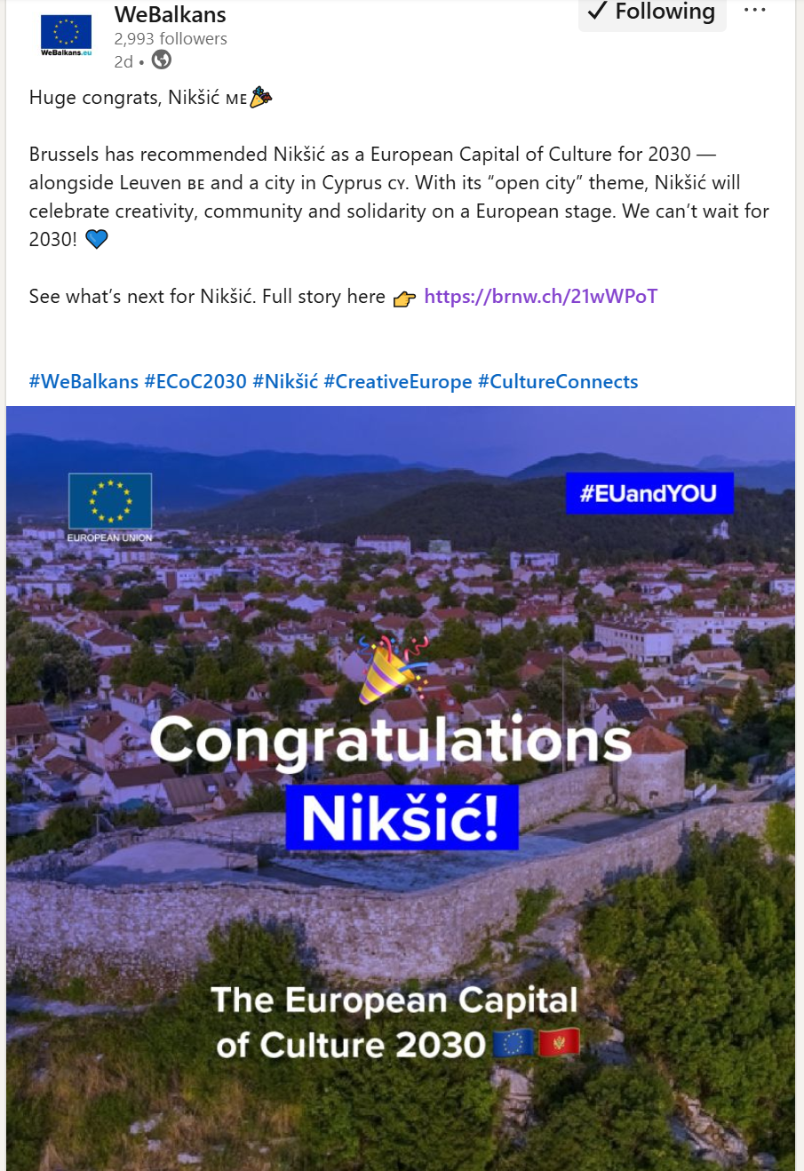 Nikšić’s “Open City” and “Being Human” approach convinced the independent panel. The ten experts proposed Nikšić over Lviv (Ukraine) to win the ECoC 2030 non-EU country title, following Novi Sad (Serbia) in 2022, Bodø (Norway) in 2024, and Skopje (North Macedonia) in 2028.