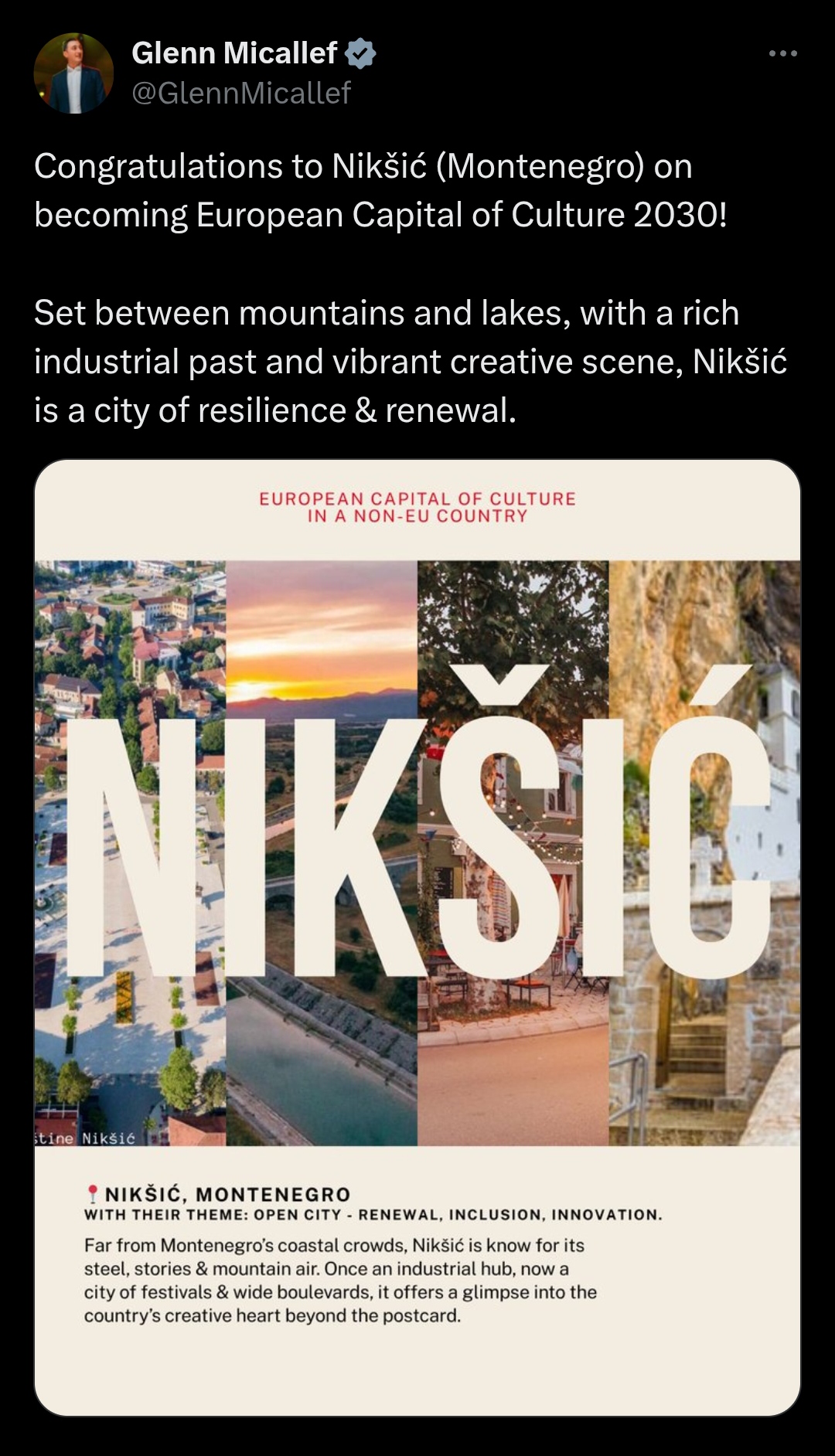 Nikšić will share the title with Leuven, Belgium. The third ECoC 2030 city will be in Cyprus, either Larnaka or Lemesos, to be announced on December 2025.