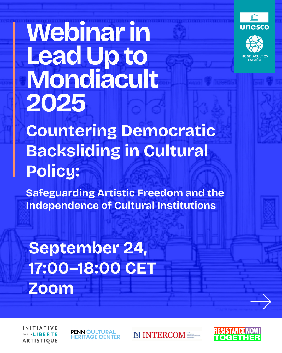 In the run-up to MONDIACULT 2025, the Artistic Freedom Initiative, together with PennCHC, Resistance Now Together, and INTERCOM, will host the virtual event “Countering Democratic Backsliding in Cultural Policy.” On 24 September 2025, the webinar will bring together cultural leaders and policy experts to discuss safeguarding artistic freedom and the independence of cultural institutions.