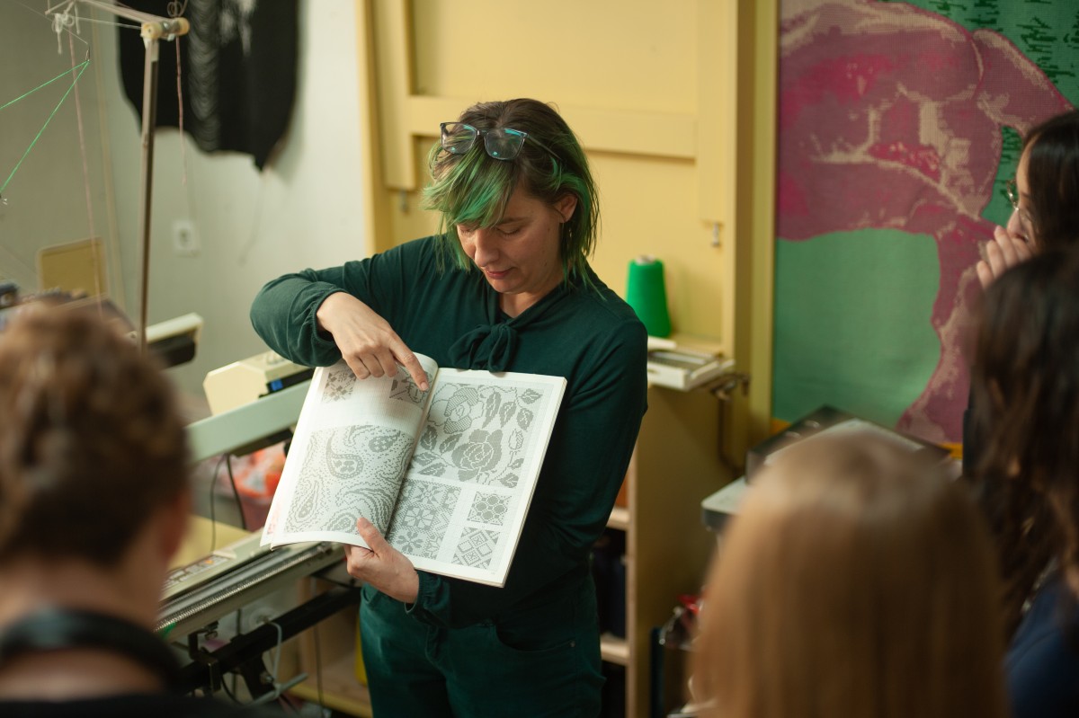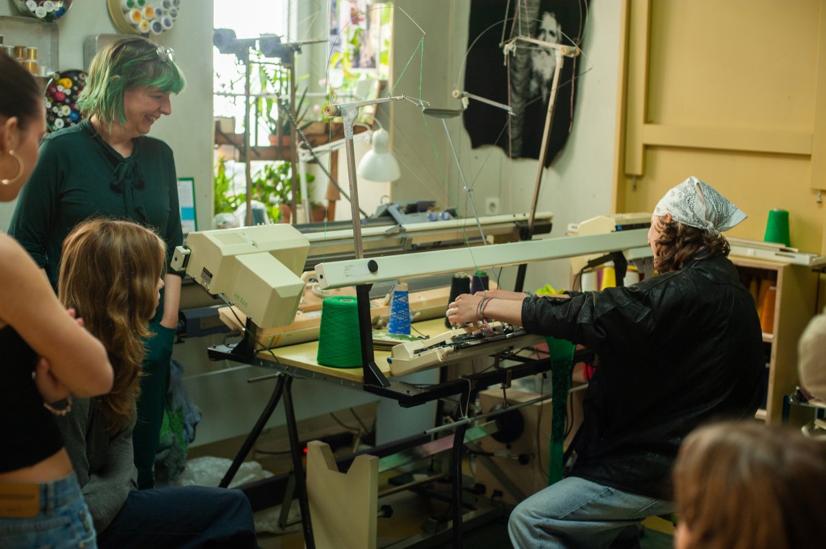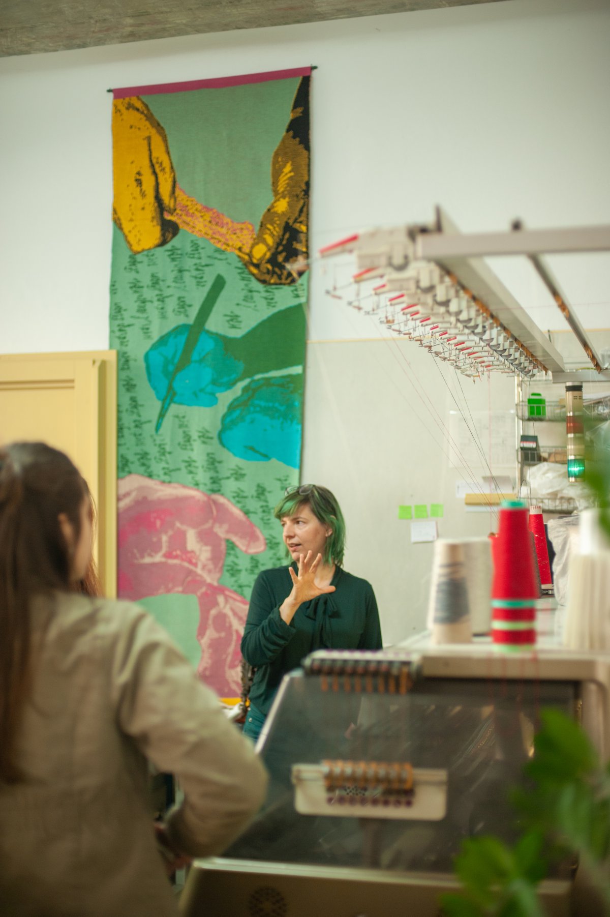 The LLab began with a Fair Isle design workshop, where students created their own knitting patterns—both digitally and by hand. This sparked reflections on material choices and the challenges of sustainable textile production. The visit to Veronika Persché’s studio was another highlight, offering students the chance to work directly on knitting machines and explore digital techniques. Discussions on copyright and design ownership added depth to their creative process.