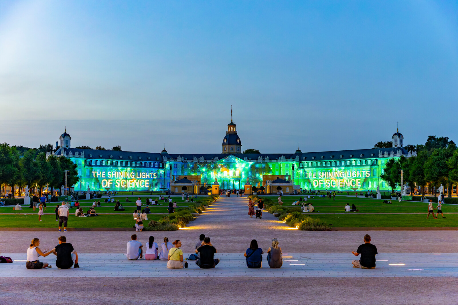 Image: The motto of the SCHLOSSLICHTSPIELE Karlsruhe 2025: "The Shining Lights of Science" © KME | Photo: Jürgen Rösner